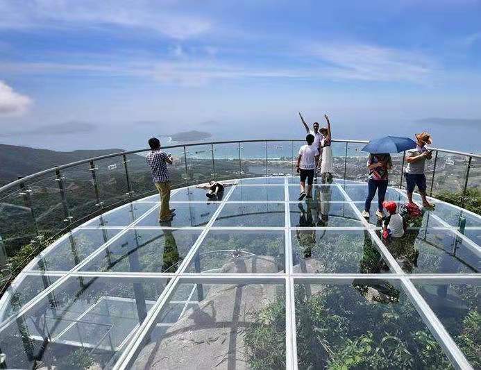 产品简介:该项目采用混凝土框架结构,以及双层夹胶钢化玻璃与不锈钢龙骨巧妙结合,固定在空中丛林,峭壁、悬崖、等风景优美,地势险峻之地,为游客游览美景带来体验的同时也保障了生命安全。 产品理念:让游客穿梭于钟灵毓秀的风景与雄关峭壁之中,与大自然接触,感受大自然的鬼斧神工与巍峨壮丽。晴天时,蓝天白云的倒影在玻璃桥与山水之间,一眼望过去风景尽收眼底,享受高山流水,江山如画之美感。阴天时,游客行走于云雾之间,内心渐渐沉淀,思绪在山水丛林之间穿梭,似有山雨欲来风满楼之心境。让游客感受心灵与视觉的升华与冲击。